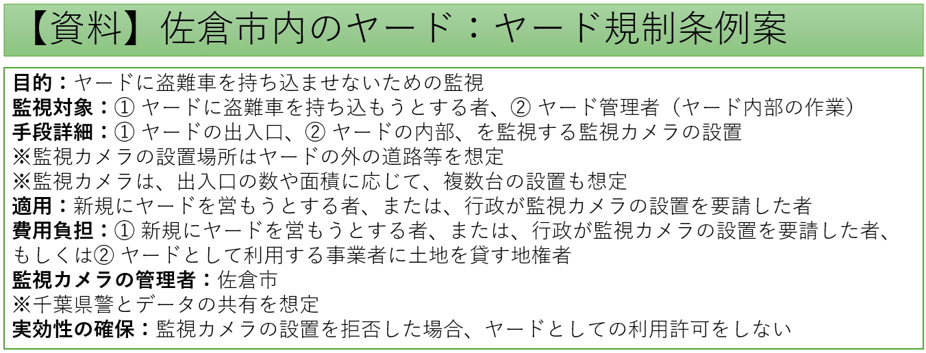 内容はお手元の資料のとおりですが、条例案の骨子はヤードの出入口や道路、または敷地内に監視カメラを設置し、その設置の初期費用や運用費用をヤード経営者に負担させること。また、当該監視カメラの管理者権限を佐倉市が保有する、とする条例案です。